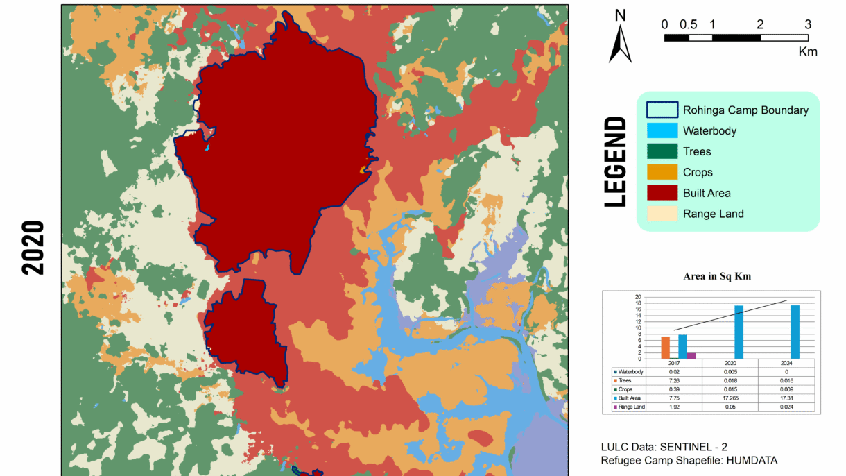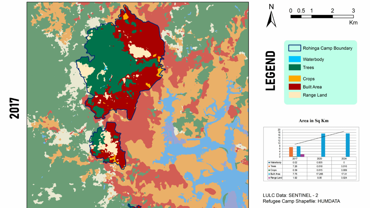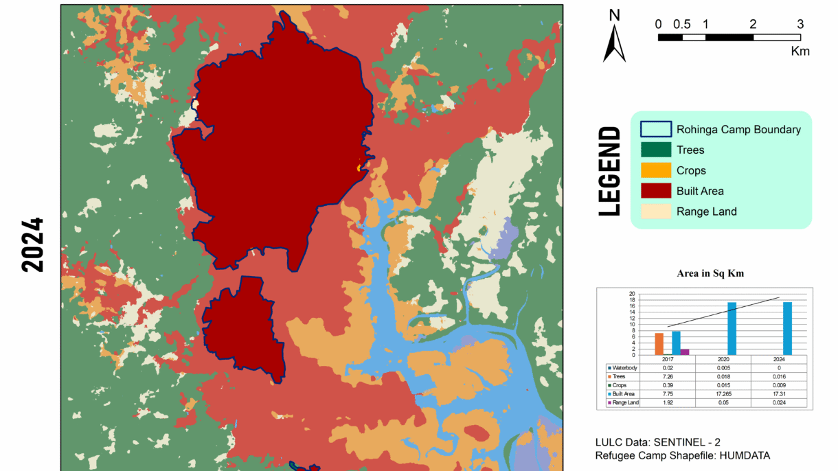 This series illustrates land use and land cover (LULC) shifts across three key years—2017, 2020, and 2024—highlighting dramatic environmental changes in response to Rohingya settlement. Between 2017 and 2024, built-up areas surged from 7.75 km² to 17.31 km², while tree cover plummeted from 7.26 km² to just 0.016 km², indicating large-scale deforestation—trends confirmed by satellite-based studies showing up to 74% forest loss from 2015–2021 and over 3,200 ha cleared by 2024.