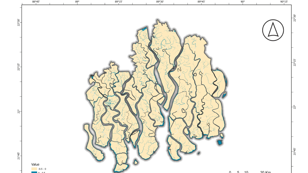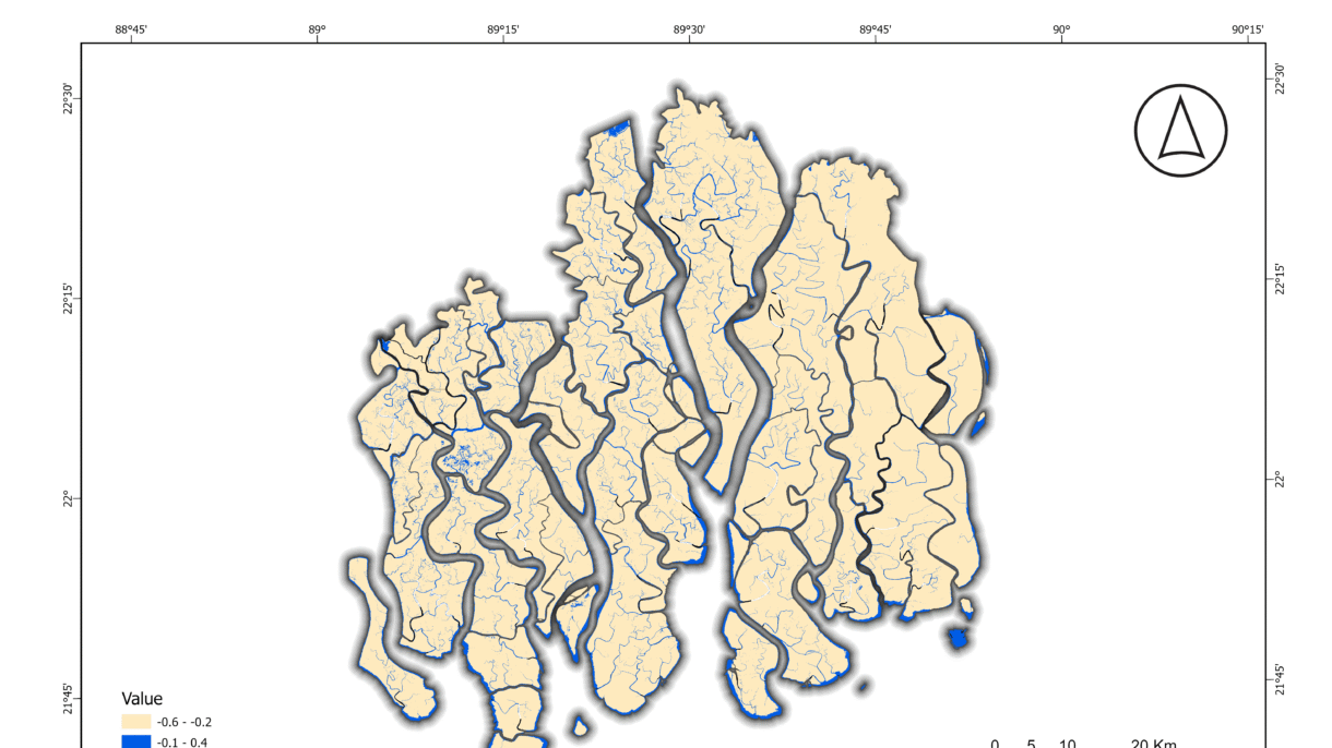 The NDWI map of the Sundarban clearly delineates the vast and complex network of waterways. The light blue shades represent the open water bodies, while the beige and gray areas correspond to land. The sharp contrast between land and water demonstrates the index’s effectiveness in this environment. The numerous small, interconnected channels are visible, highlighting the forest’s unique hydrology.
