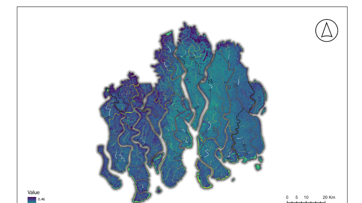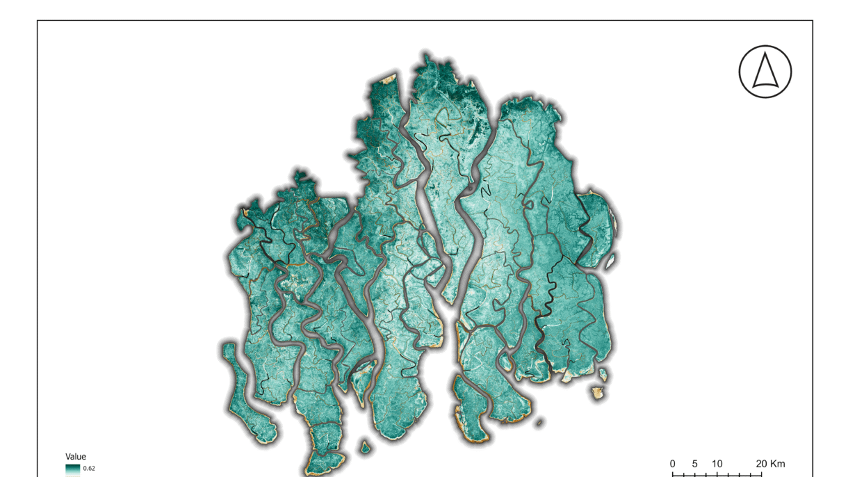The SAVI map of the Sundarban exhibits a visual pattern very similar to the NDVI map, with healthy vegetation represented by shades of teal and green. This similarity suggests that soil background has a minimal effect on the vegetation signal in this dense, canopied forest. This is expected, as the mangrove forest floor is often covered by water or is a dense root network, minimizing exposed soil. The highest values correspond to dense vegetation, while lower values are found in waterways and coastal areas.