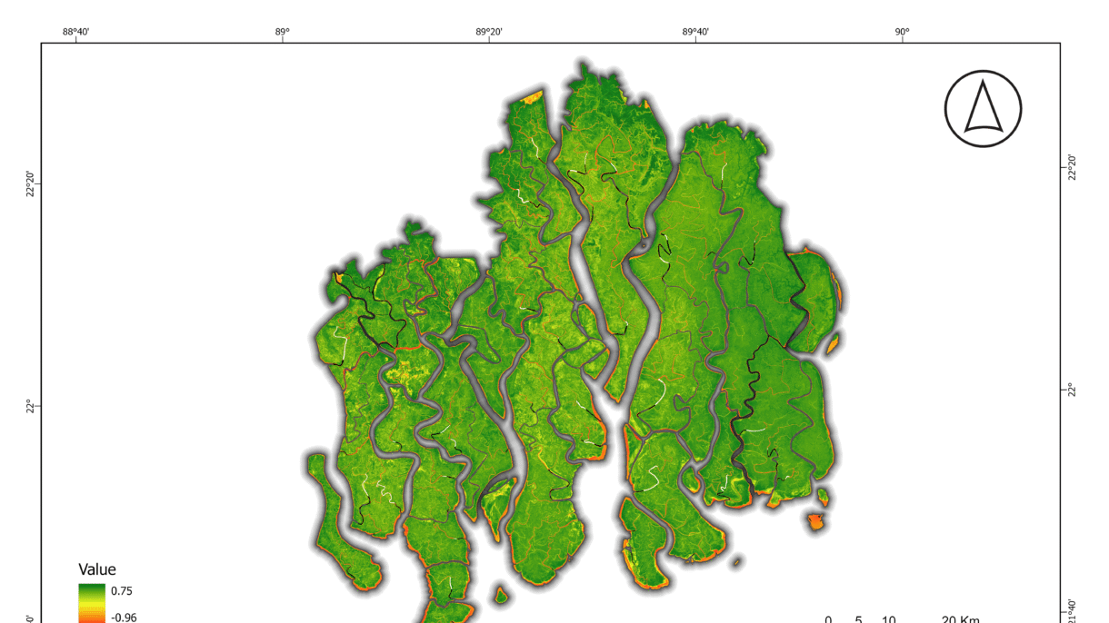The NDVI map for the Sundarban shows a significant majority of the area in shades of green, indicating a high density of healthy vegetation. The highest values (bright green) are found in the core, densely forested areas. The lower values (yellow and orange) are concentrated along the riverbanks and coastal fringes, suggesting either sparse vegetation or the presence of a mix of land and water. The very low values (darker shades) correspond to open water bodies. The overall high NDVI values confirm that the Sundarban remains a remarkably healthy and dense forest ecosystem.