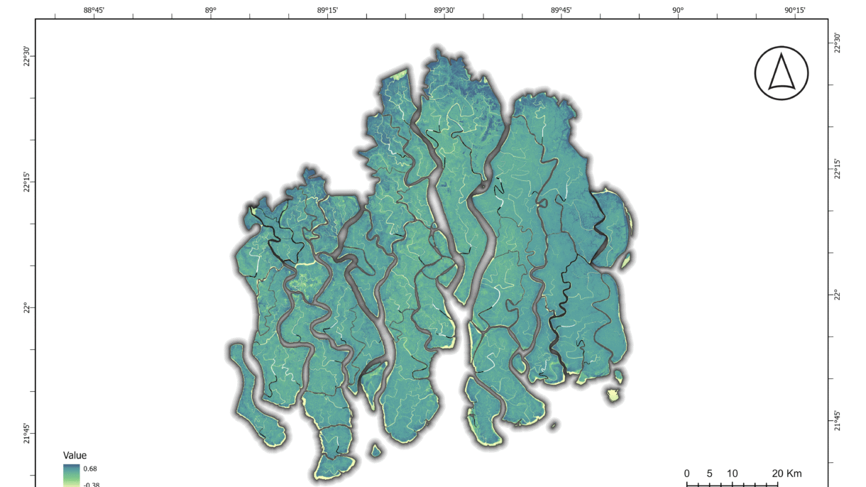 NDWI is vital for monitoring changes in surface water extent, which is critical for flood mapping, drought monitoring, and managing water resources. In a coastal system like the Sundarban, it’s essential for mapping the extensive tidal creeks and channels.