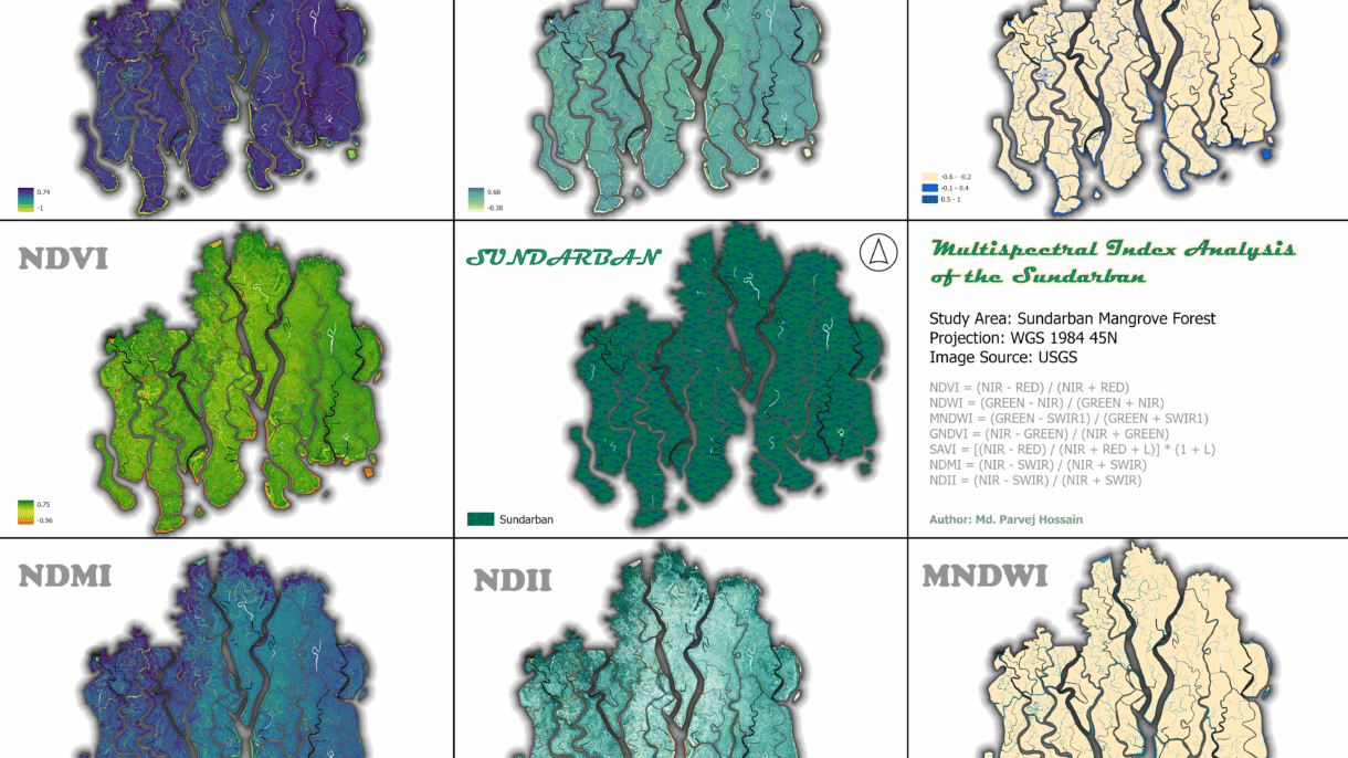 This multi-spectral index analysis of the Sundarban Mangrove Forest provides a comprehensive and detailed snapshot of the ecosystem’s current health. The maps successfully delineate key components: healthy vegetation, intricate waterways, and overall moisture content. The high values for NDVI, GNDVI, NDMI, and NDII confirm the vitality of the forest, while the clear delineation of water bodies by NDWI and MNDWI highlights the importance of the river network.